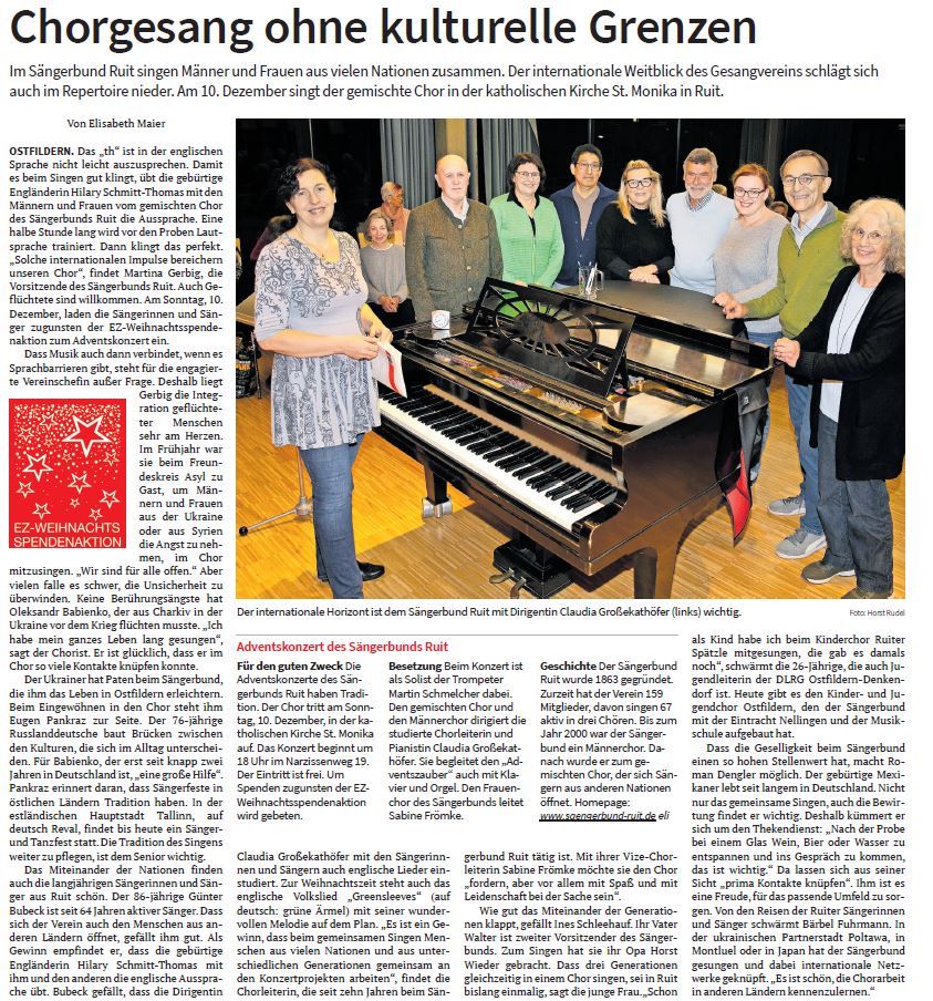 OSTFILDERN Das „th“ ist in der englischen Sprache nicht leicht auszusprechen. Damit es beim Singen gut klingt, übt die gebürtige Engländerin Hilary Schmitt-Thomas mit den Männern und Frauen vom gemischten Chor des Sängerbunds Ruit die Aussprache. Eine halbe Stunde lang wird vor den Proben Lautsprache trainiert. Dann klingt das perfekt. „Solche internationalen Impulse bereichern unseren Chor“, findet Martina Gerbig, die Vorsitzende des Sängerbunds Ruit. Auch Geflüchtete sind willkommen. Am Sonntag, 10. Dezember, laden die Sängerinnen und Sänger zum Adventskonzert ein. Dass Musik auch dann verbindet, wenn es Sprachbarrieren gibt, steht für die engagierte Vereinschefin außer Frage. Deshalb liegt Gerbig die Integration geflüchteter Menschen sehr am Herzen. Im Frühjahr war sie beim Freundeskreis Asyl zu Gast, um Männern und Frauen aus der Ukraine oder aus Syrien die Angst zu nehmen, im Chor mitzusingen. „Wir sind für alle offen.“ Aber vielen falle es schwer, die Unsicherheit zu überwinden. Keine Berührungsängste hat Oleksandr Babienko, der aus Charkiv in der Ukraine vor dem Krieg flüchten musste. „Ich habe mein ganzes Leben lang gesungen“, sagt der Chorist. Er ist glücklich, dass er im Chor so viele Kontakte knüpfen konnte. Der Ukrainer hat Paten beim Sängerbund, die ihm das Leben in Ostfildern erleichtern. Beim Eingewöhnen in den Chor steht ihm Eugen Pankraz zur Seite. Der 76-jährige Russlanddeutsche baut Brücken zwischen den Kulturen, die sich im Alltag unterscheiden. Für Babienko, der erst seit knapp zwei Jahren in Deutschland ist, „eine große Hilfe“. Das Miteinander der Nationen finden auch die langjährigen Sängerinnen und Sänger aus Ruit schön. Der 86-jährige Günter Bubeck ist seit 64 Jahren aktiver Sänger. Dass sich der Verein auch den Menschen aus anderen Ländern öffnet, gefällt ihm gut. Als Gewinn empfindet er, dass die gebürtige Engländerin Hilary Schmitt-Thomas mit ihm und den anderen die englische Aussprache übt. Bubeck gefällt, dass die Dirigentin Claudia Großekathöfer mit den Sängerinnnen und Sängern auch englische Lieder einstudiert. Zur Weihnachtszeit steht auch das englische Volkslied „Greensleeves“ (auf deutsch: grüne Ärmel) mit seiner wundervollen Melodie auf dem Plan. Wie gut das Miteinander der Generationen klappt, gefällt Ines Schleehauf. Ihr Vater Walter ist zweiter Vorsitzender des Sängerbunds. Zum Singen hat sie ihr Opa Horst Wieder gebracht. Dass drei Generationen gleichzeitig in einem Chor singen, sei in Ruit bislang einmalig, sagt die junge Frau. Dass die Geselligkeit beim Sängerbund einen so hohen Stellenwert hat, macht Roman Dengler möglich. Der gebürtige Mexikaner lebt seit langem in Deutschland. Nicht nur das gemeinsame Singen, auch die Bewirtung findet er wichtig. Deshalb kümmert er sich um den Thekendienst: „Nach der Probe bei einem Glas Wein, Bier oder Wasser zu entspannen und ins Gespräch zu kommen, das ist wichtig.“ Ihm ist es eine Freude, für das passende Umfeld zu sorgen. Von den Reisen der Ruiter Sängerinnen und Sänger schwärmt Bärbel Fuhrmann. In der ukrainischen Partnerstadt Poltawa, in Montluel oder in Japan hat der Sängerbund gesungen und dabei internationale Netzwerke geknüpft.